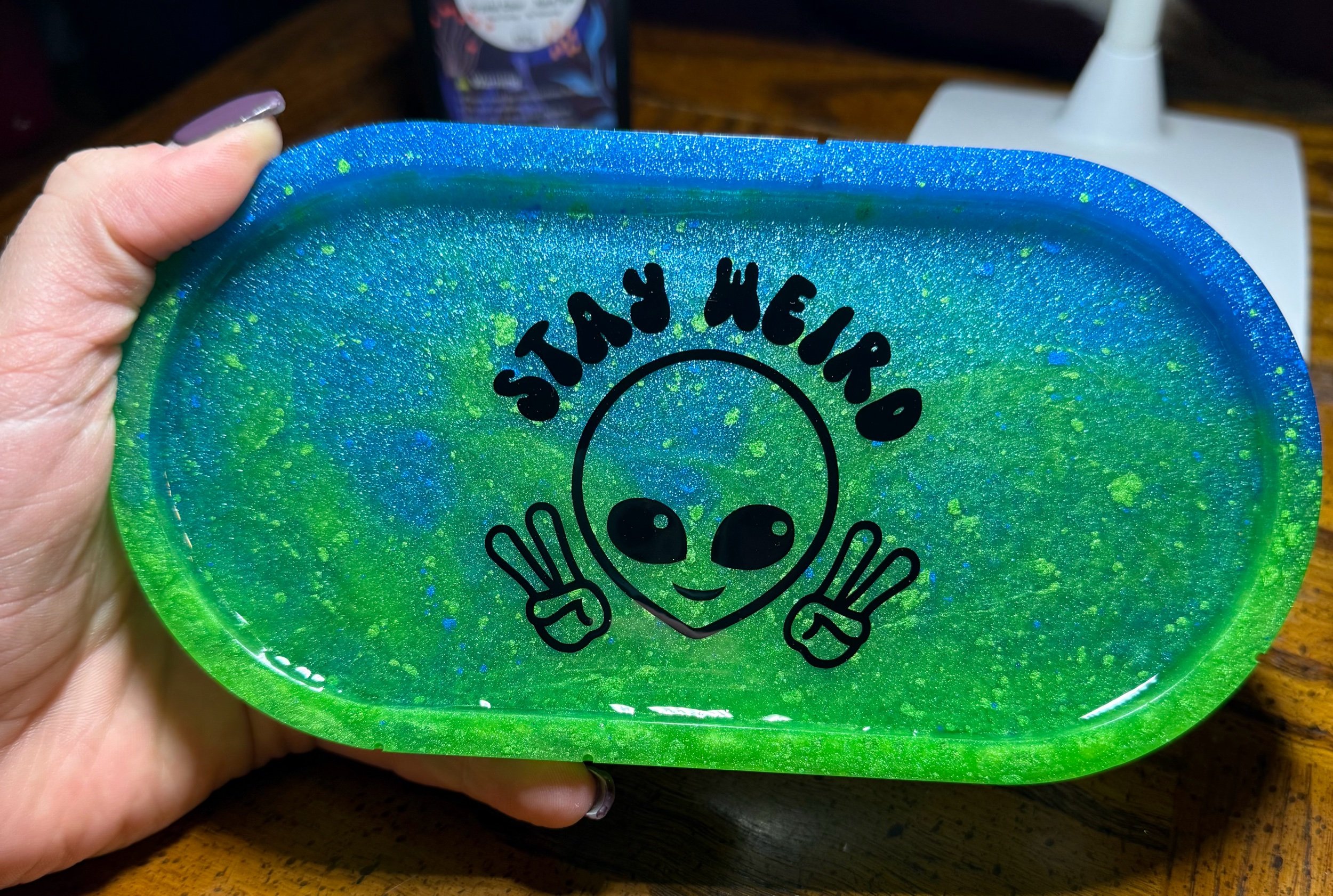 These trays are handcrafted using high-quality epoxy resin and vibrant mica powders to create a smooth, glossy, one-of-a-kind finish. Each piece is poured, colored, and detailed by hand, making every tray completely unique.