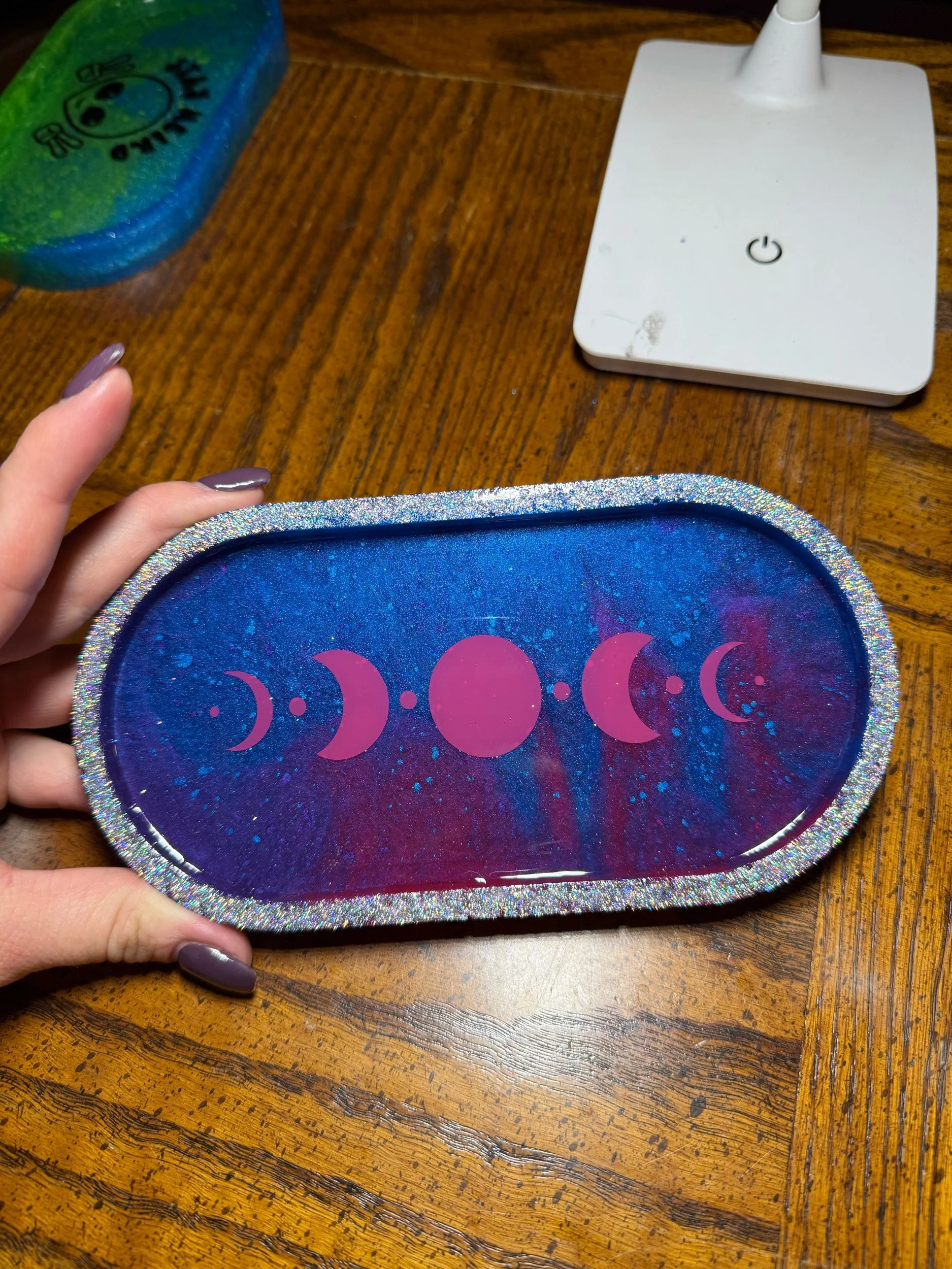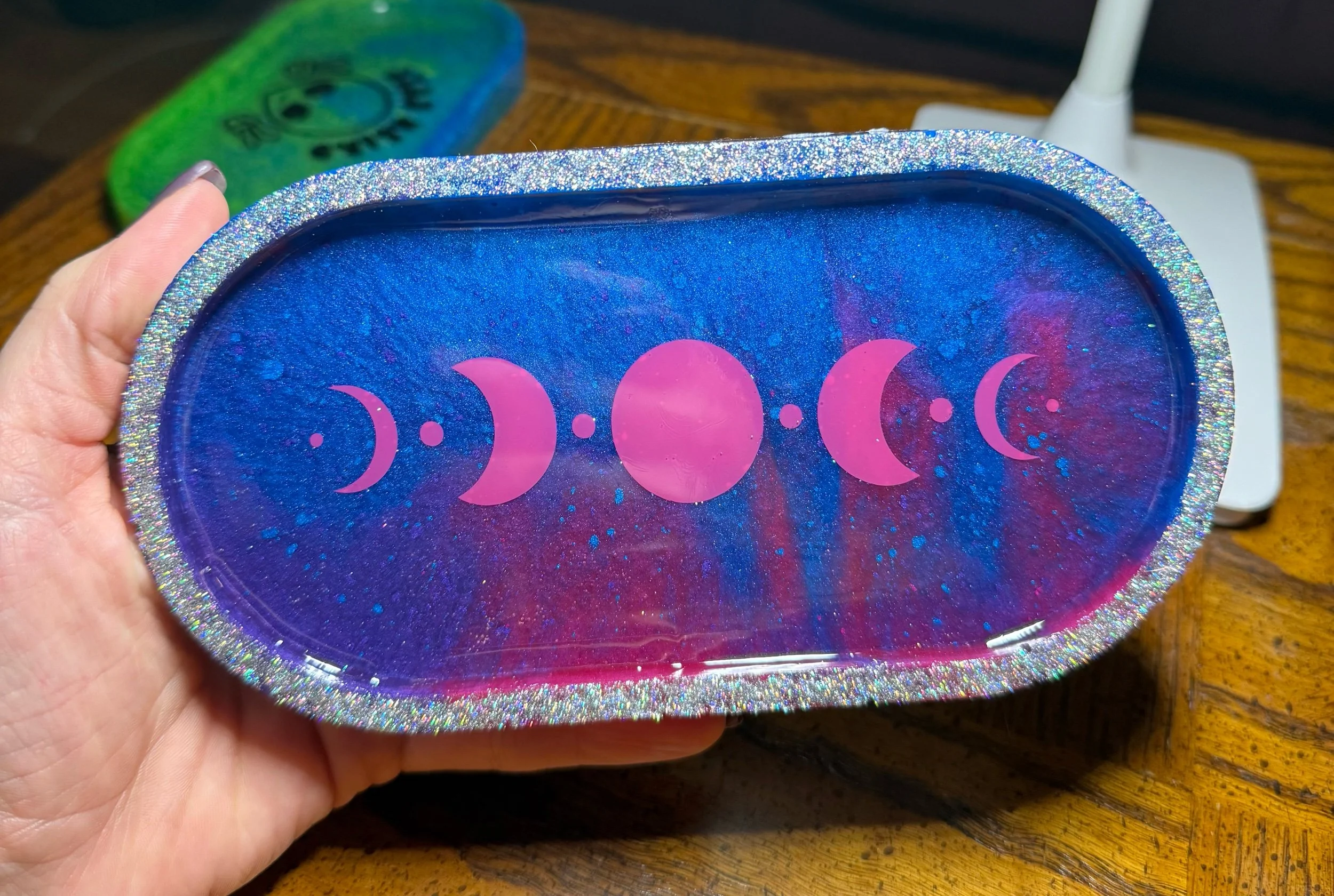 These trays are handcrafted using high-quality epoxy resin and vibrant mica powders to create a smooth, glossy, one-of-a-kind finish. Each piece is poured, colored, and detailed by hand, making every tray completely unique.